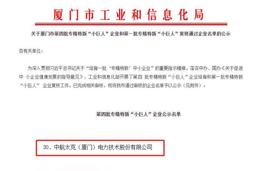近日,全国第四批专精特新“小巨人”企业名单公示结束,中航太克凭借在高端工业电源、锂电池储能系统及数字网络能源领域的优异表现,成功入选国家级专精特新“小巨人”企业。